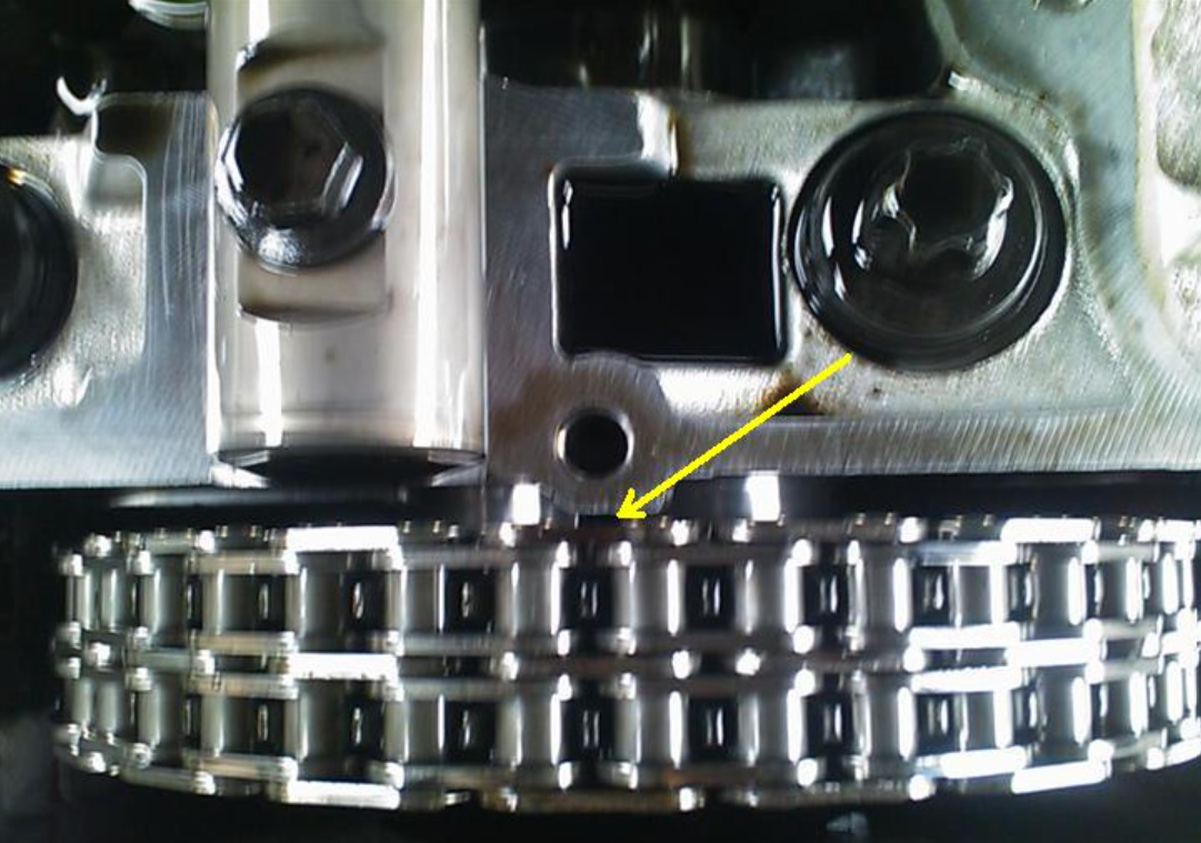 This will also coincide with 2 different coloured links on the timing chain itself.