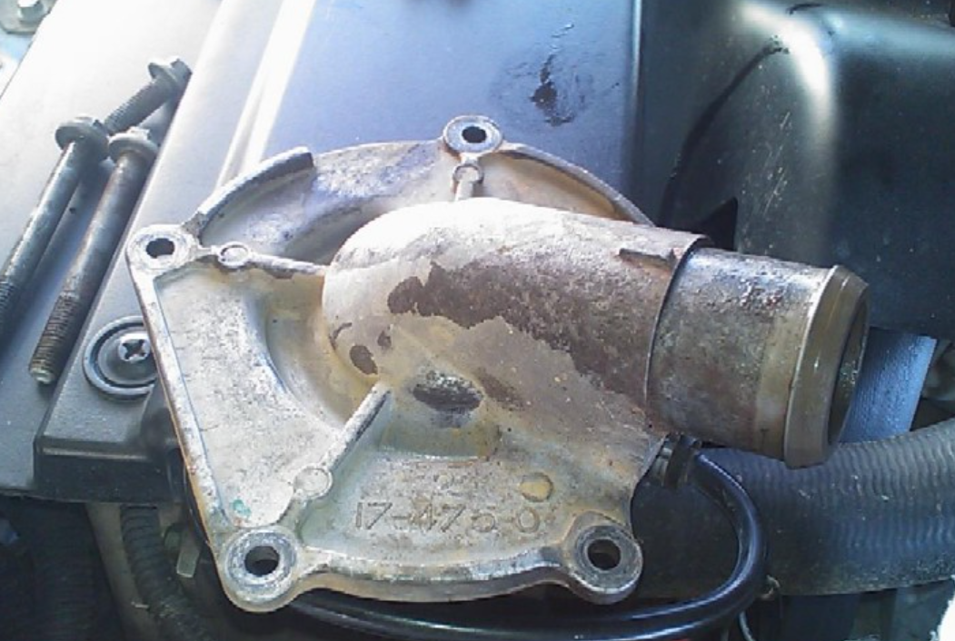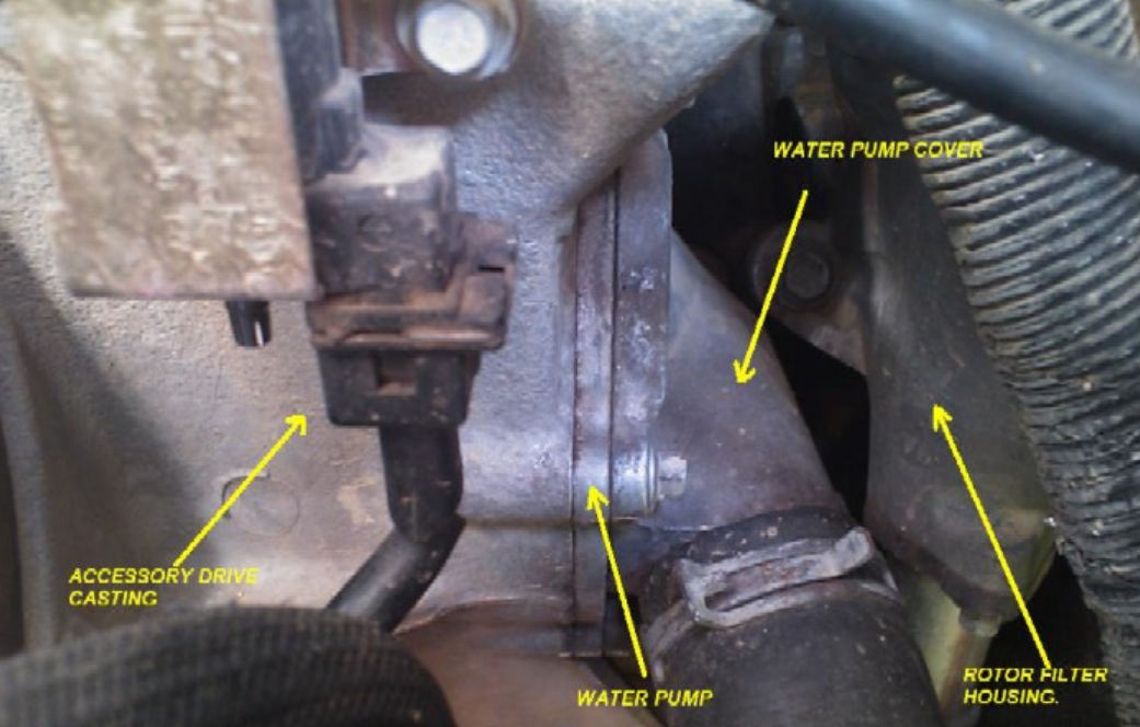 Old pump above, the "weep" hole in the pump shows evidence of coolant leakage...the holes line up with the holes / drillings in the accessory casting seen in the picture below..