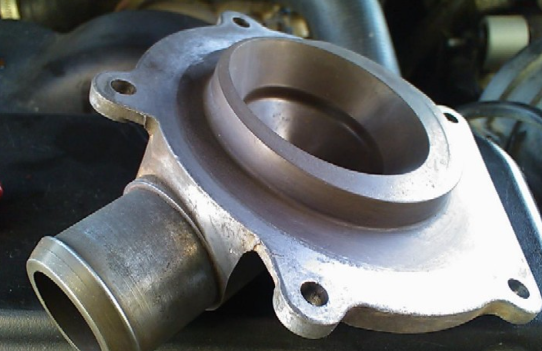 Due to the pump’s location, a failed bearing must allow water to escape—otherwise, it risks accumulating behind the power steering pump. This is managed via a small weep hole (or drilling) in the accessory casting, which safely channels the coolant out rather than allowing pressure to build up behind the steering pump.
