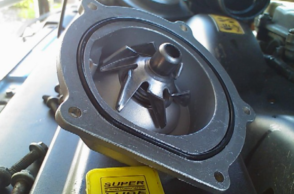 The water pump can fail in several ways. Leaks may occur at the seal between the pump and its cover, or at the junction between the pump and the accessory drive casting. Additionally, the pump's internal bearing is prone to failure over time.